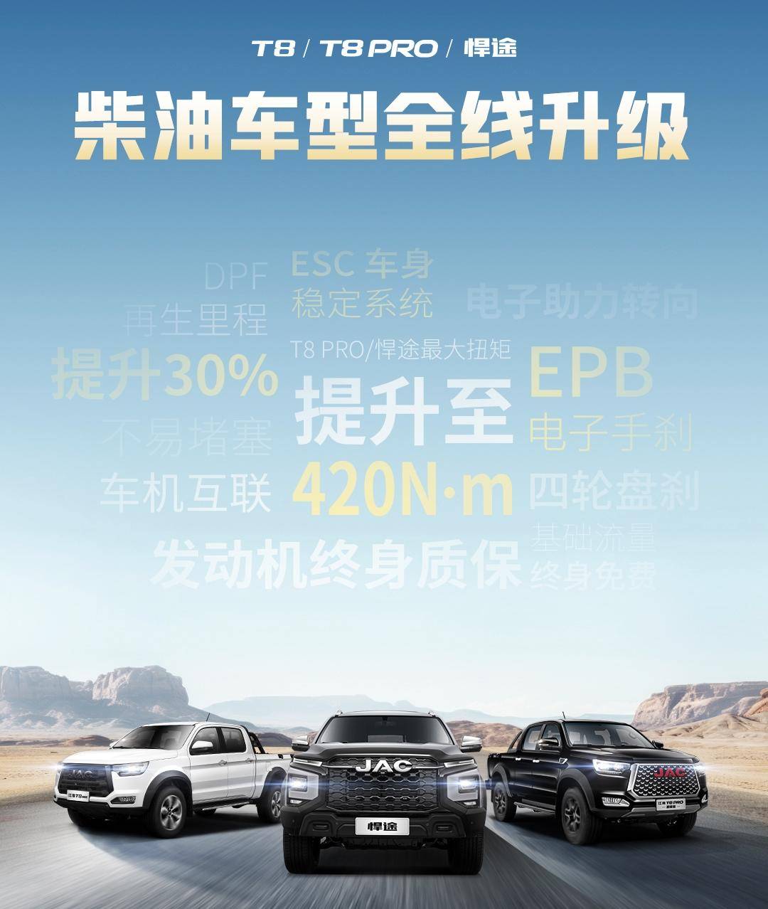 燃油车型全线升级,2.0T柴油动力最大扭矩提升至420N·m,江淮T8劲擎版、江淮T6租赁版先后上市,夯实“底盘专家,创富典范”的价值基石。新能源车型实现重大突破,江淮新能源皮卡双子星——悍途PHEV与悍途EV在2025成都国际车展正式上市,打造华系新能源皮卡新名片。燃油、混动、纯电齐头并进,江淮皮卡产品矩阵持续完善,满足商用、家用以及越野等全场景用车需求。