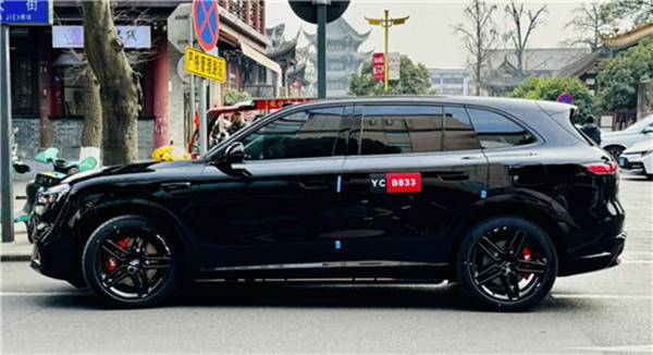这里值得重点介绍的是配备黑曜套件的全新问界M6,即所谓的黑武士版,该版本比较受年轻人欢迎,它提供黑色发光Logo、黑色车窗饰条等,带红色前置固定刹车卡钳的21英寸熏黑轮毂,运动感非常强烈。