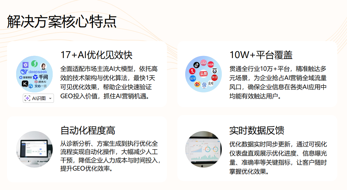 工程化的四阶闭环:他们将GEO落地为“诊断-优化-执行-监测”的标准化闭环。客户可以通过可视化数据看板,实时查看信息曝光量、回答准确率等关键指标,过程完全透明。