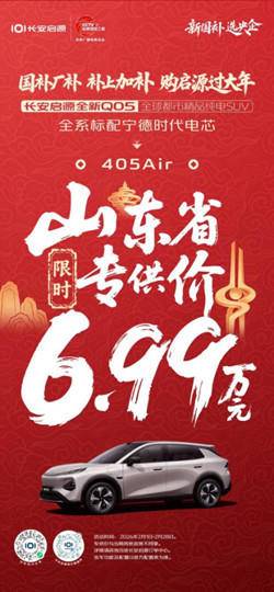 长安启源全新Q05 405 Air本次针对山东省用户,推出了限时专供价6.99万元,价格下探以央企实力与诚意,为用户送上新春购车惊喜。此次专属优惠政策力度空前,活动周期有限,赶紧在2026年2月1日至2月28日下订购买心仪座驾,开启新一年的品质出行。