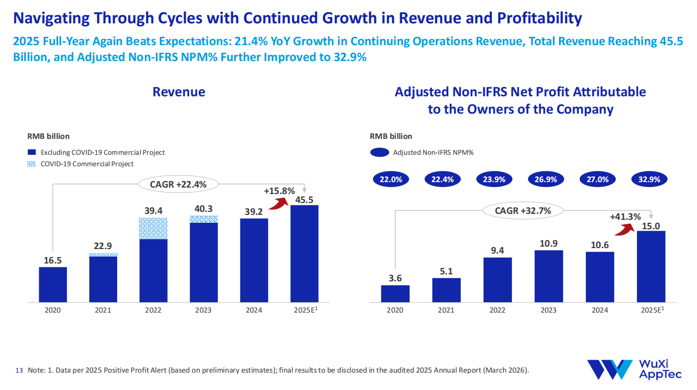 驱动估值修复的核心动力,正是公司持续释放的积极业绩信号。1月12日晚间,药明康德发布业绩预增公告,公司预计2025年全年实现营业收入454.56亿元,同比增长15.84%,其中持续经营业务收入同比增长21.40%,高于整体营收增速;经调整non-IFRS归母净利润149.57亿元,同比增长41.33%,多个口径下的净利润数据均刷新历史新高,且净利润增速大幅领先于营收增速,意味着公司核心业务的盈利能力和经营质量仍在不断提升,也让股东减持这一短期事件的影响逐步淡化。