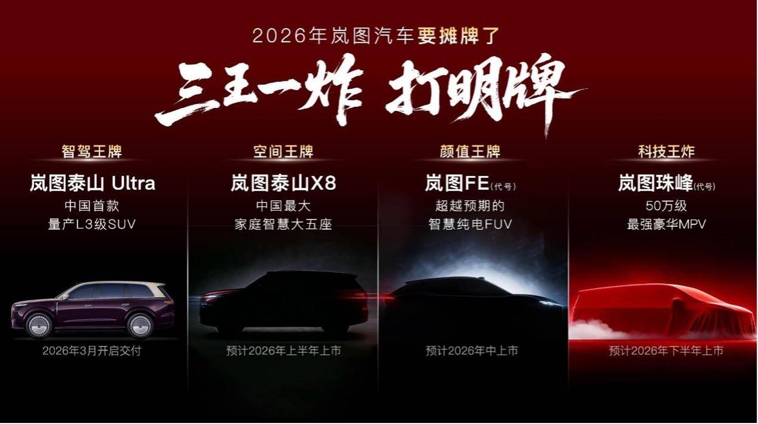 岚图泰山X8是一张“空间王牌”,将于2026年上半年上市。该车将搭载问界M9同款四激光雷达,首发华为全新一代交互座舱,同时还拥有独一无二的超大空间。项目代号“岚图FE”则是一张“颜值王牌”,它是岚图联合华为乾崑重磅推出的“超越预期的智慧纯电FUV”,具备高颜值的设计美学、行业领先的四激光雷达感知系统,L3级智能辅助驾驶硬件,领先一代的AI交互智能座舱等优势,新车预计在2026年中上市。