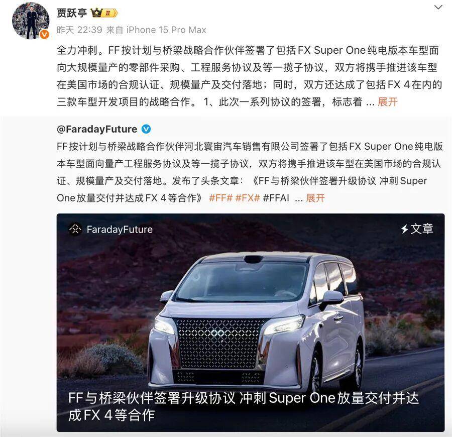 FF和河北寰宙签署一揽子协议的主要目的是为推进FX Super One纯电版本车型的量产,贾跃亭微博提到,此次一系列协议的签署,标志着FF与桥梁伙伴的战略合作关系进一步升级和深化,双方将共同冲刺FX Super One规模量产交付,进一步确保今年SOD各阶段的按期完成。