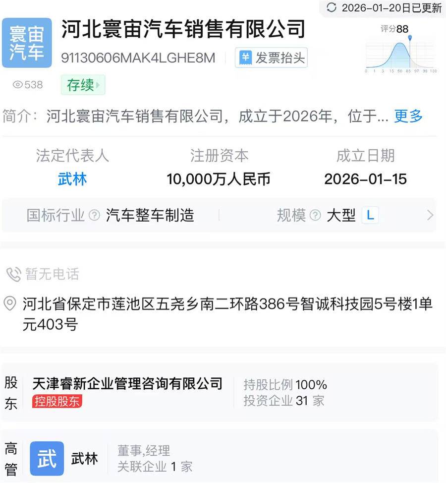 但这事,与长城汽车也逃不了关系。天眼查APP显示,河北寰宙由天津睿新企业管理咨询有限公司100%持股,表面上与长城汽车没什么关联。但天津睿新曾间接投资蜂巢能源旗下多家公司,而蜂巢能源与长城汽车的关系尽人皆知。