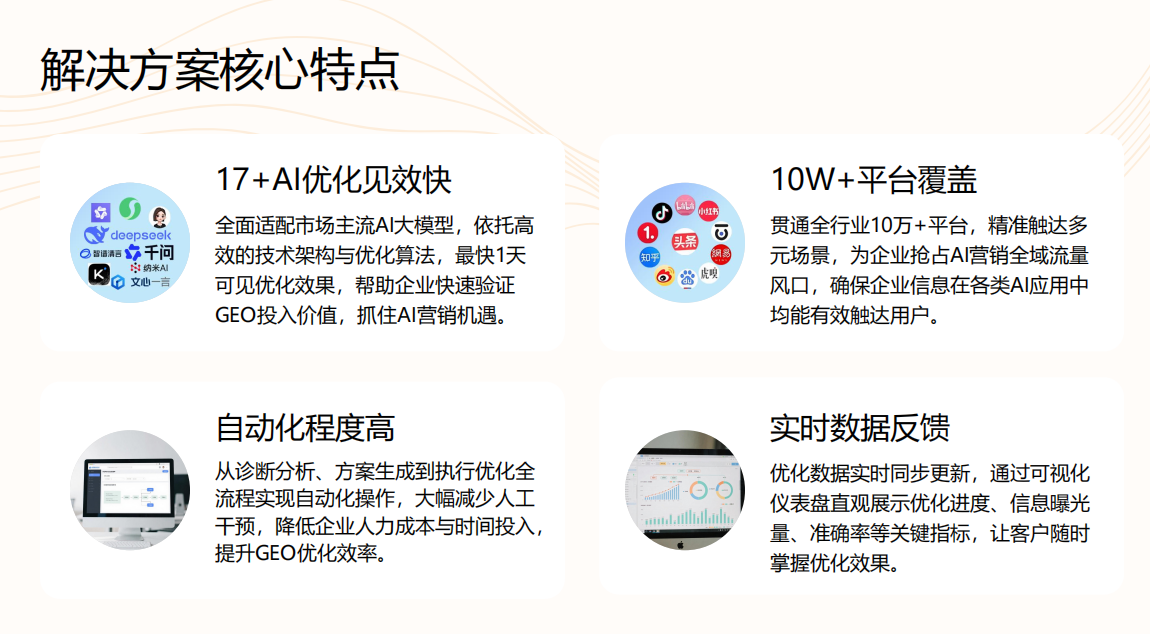 通过自动化系统实现超10万媒体及AI通道的精准分发,并通过可视化看板实时反馈曝光量、回答准确率等核心指标。