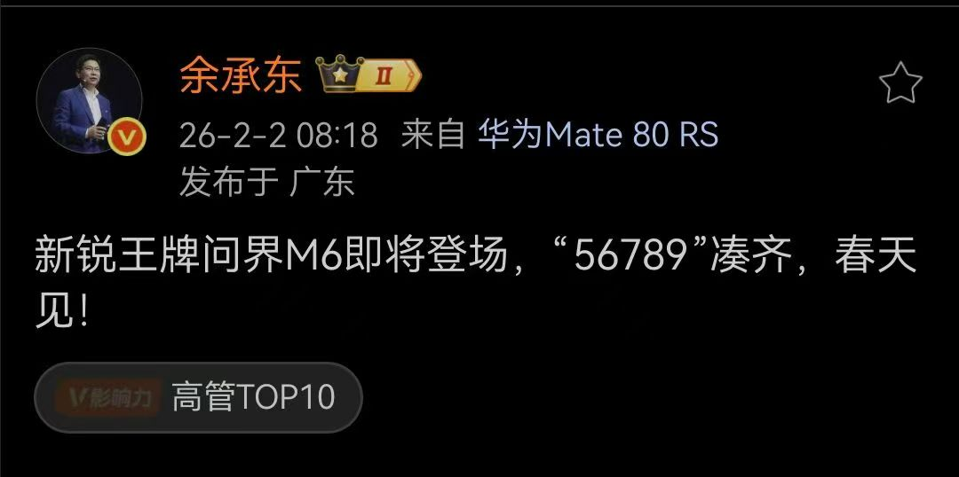 在2026年鸿蒙智行的“五界”矩阵仍然会发布多款新车,其中也包括倍受关注,同时凑齐“56789”的问界M6。