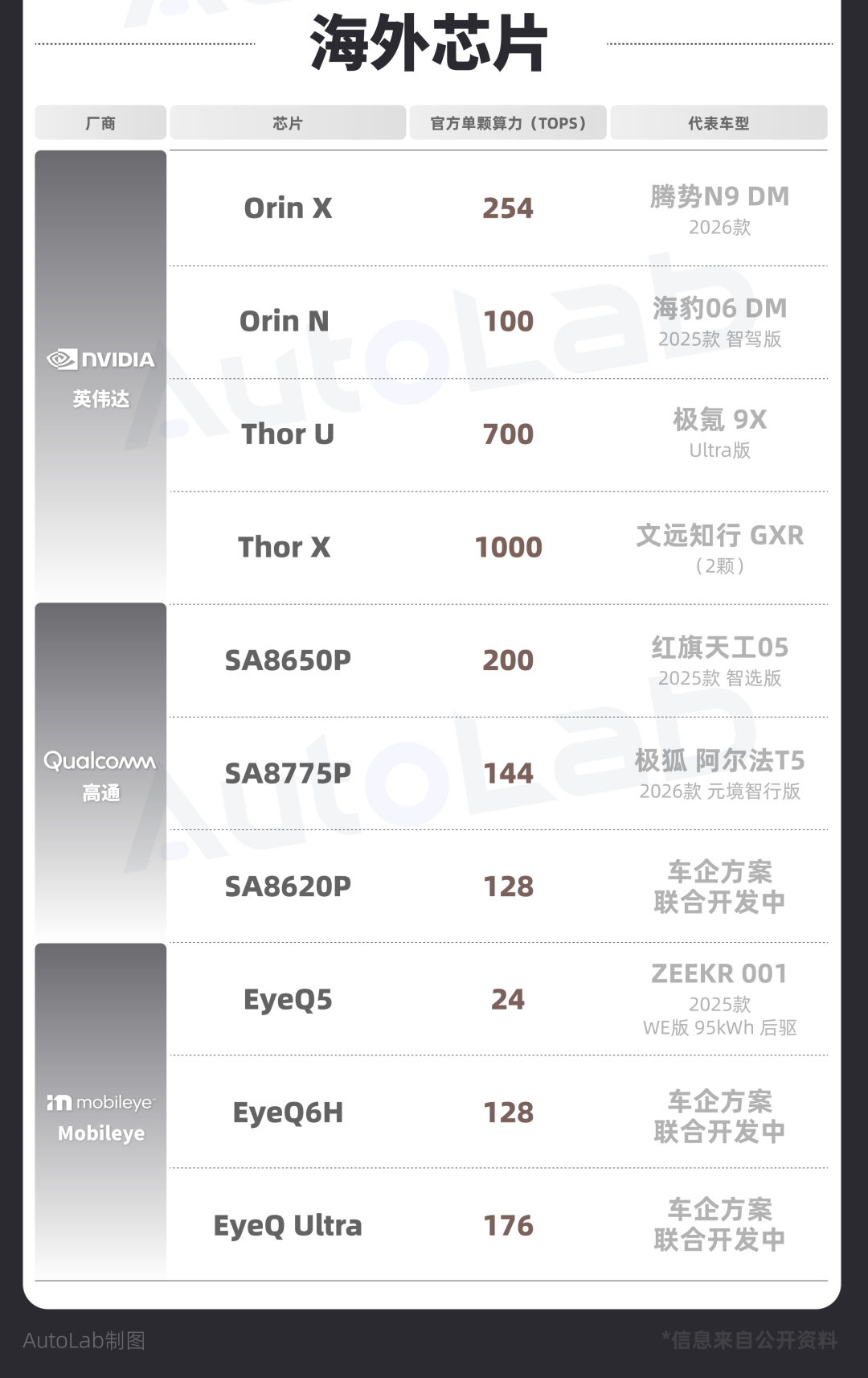 至于海外芯片,代表选手自然是英伟达,其最新的Thor-U芯片已经成为了高端车型的代表。