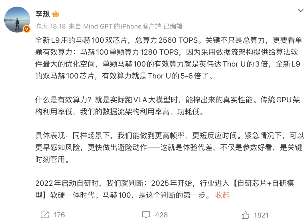 如果就自研芯片的蔚小理三家来看,蔚来要重返第一梯队,小鹏要直奔L4,理想则要打造具身智能机器人。