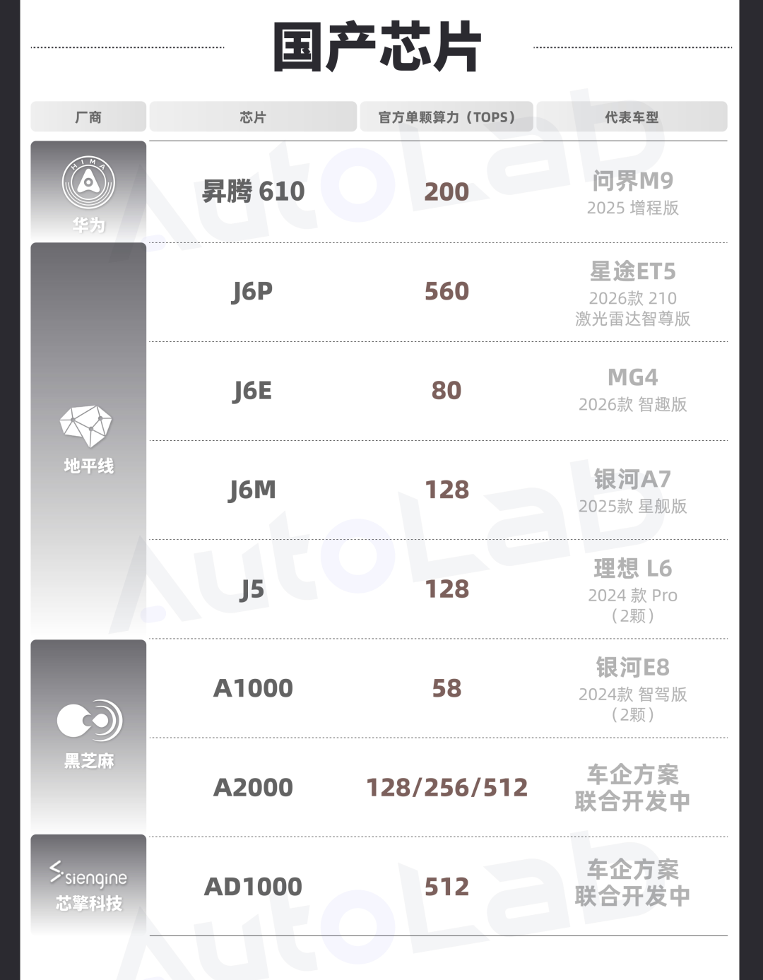 其他国产自研芯片方面,华为和地平线的芯片是目前市占率较高的品牌。