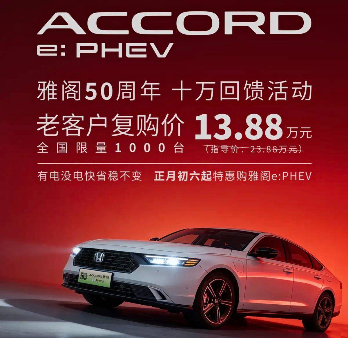 兄弟们,我真是没想到啊!农历新年正月初六,广汽本田居然推出了一个雅阁50周年的十万回馈活动,而活动的内容也相当“劲爆”,那就是为老客户复购雅阁e:PHEV(以下简称插混版雅阁)车型给到了一个13.88万元的超低价格。