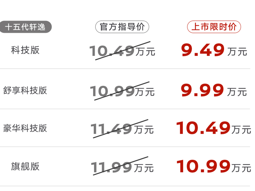 作为燃油销量第一车,轩逸如今也已经是迎来了第十五代车型的上市。从价格上来看,第十五代轩逸的官方指导价为10.49-11.99万元,上市限时价为9.49-10.99万元,整个的售价还是一如既往的亲民。