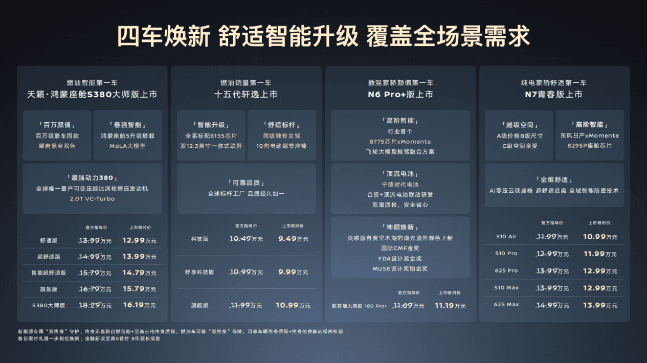 为回馈广大用户支持与信赖,此次春季发布会同步推出新能源专属“双终身”守护、燃油车可靠“双终身”保障。其中,N6/N7可享终身无套路自燃包赔及三电终身质保权益;天籁全系及十五代轩逸可享终身免费保养服务;天籁全系可享整车终身质保,轩逸全系可享动力总成终身质保。同时,东风日产针对购车用户,还带来“至高0首付8年超长低息”,限时购车享至高19000元装备礼等多重好礼,以及夜间试驾随到随享的暖心服务,并且延续新春用户关怀服务的核心举措,携品质好车、亲民价格、安心服务,开启2026新年最强家轿购车季。