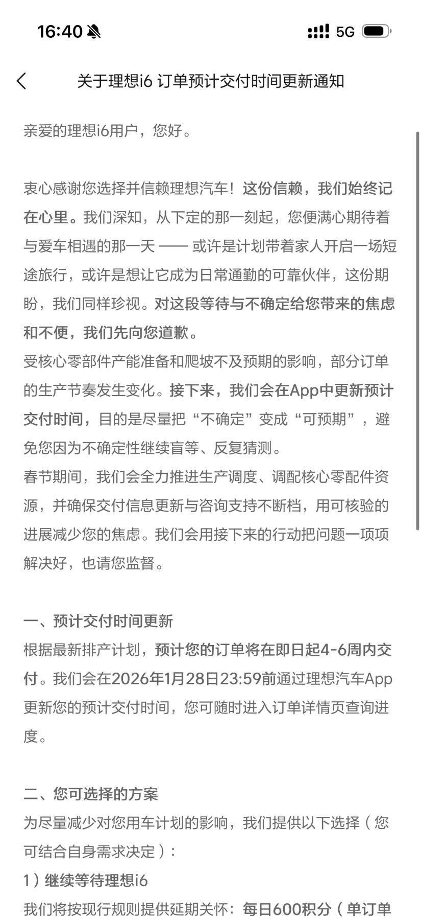 同样来自深圳的彭先生(化名),2025年10月9日锁单理想I6四驱车型,“当时只有口头承诺年前提车,但1月份官方已经承认是单方面逾期。”1月下旬,他发现APP交付时间被擅自改成6-8周,“是我们车主自发统计排产才发现严重滞后,多次质问交付专员,他们才说受核心零部件供应波动影响。”彭先生告诉车友公社。