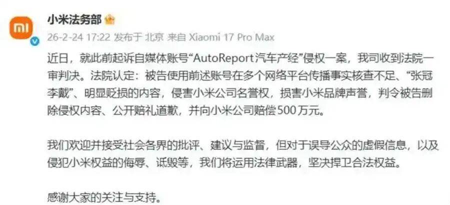 【文/财圈社&道哥说车 麻建宇】日前,小米法务部发文称,自媒体账号“AutoReport汽车产经”因侵权,一审被判赔偿小米500万元。据小米法务部发文,该账号在多个网络平台传播事实核查不足、“张冠李戴”、明显贬损的内容,侵害小米公司名誉权,损害小米品牌声誉。