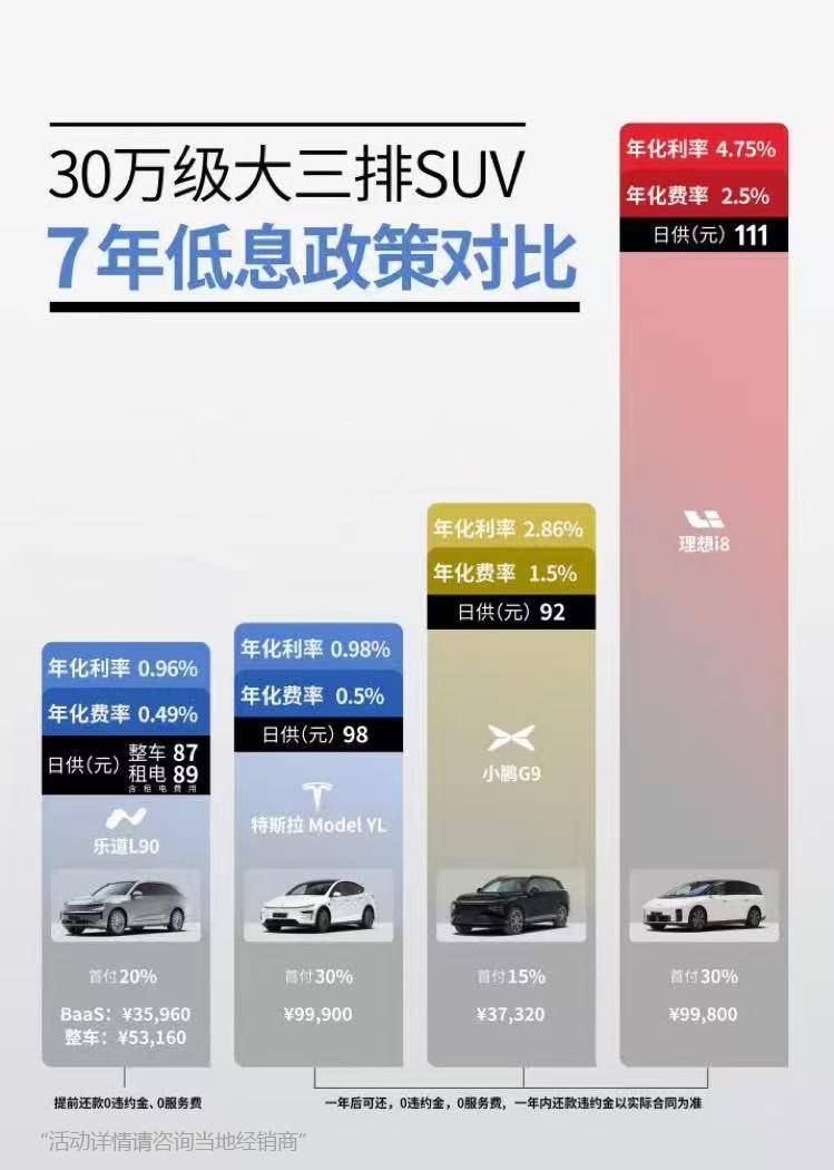 除了亲民的价格外,乐道L90推出的7年超低息金融政策,更是为家庭用户“减负到底”,这一点也与问界M7的金融方案形成了鲜明对比,进一步凸显了乐道L90的诚意。