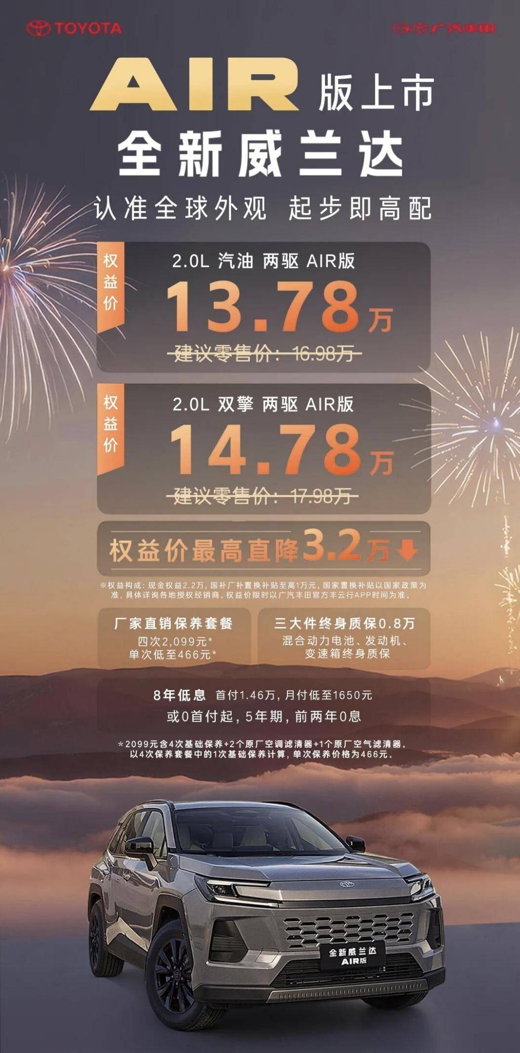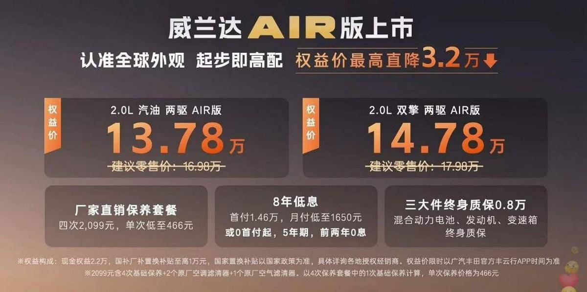 几乎同一时间,广汽丰田全新换代威兰达(参数|询价)AIR版携权益价13.78万元起杀入战场,相比老款指导价下降3.2万元。
