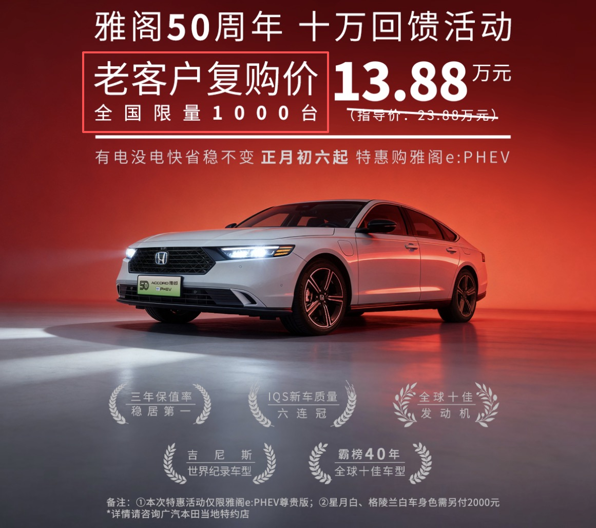 广汽本田雅阁(参数|询价)e:PHEV尊贵版老客户复购价直接下探至13.88万元,相较23.88万元的官方指导价,降幅高达10万元。