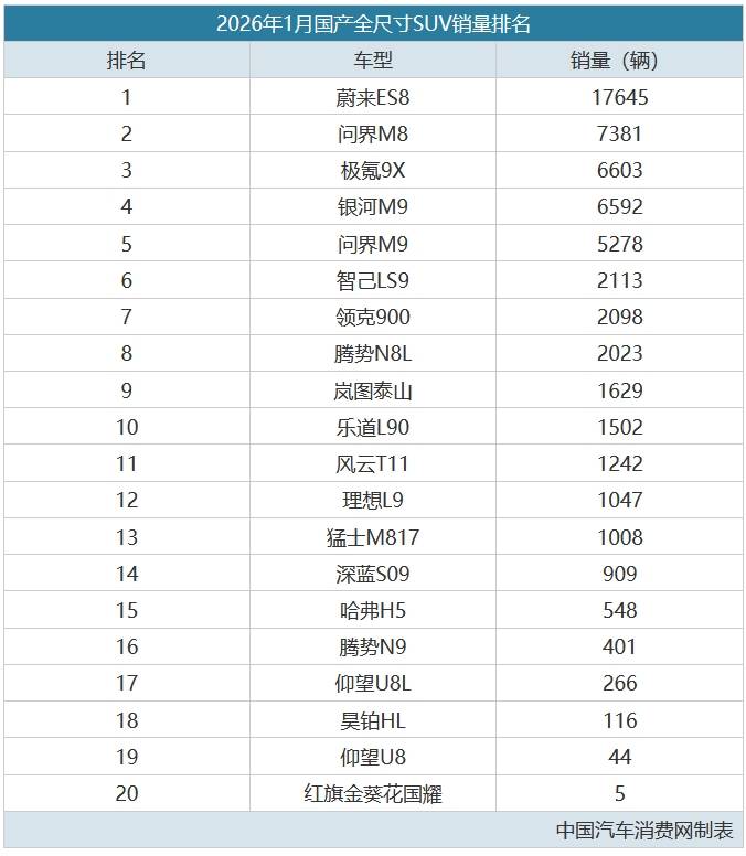 受绿牌车征收购置税影响,国产绿牌全尺寸SUV销量整体低走,不过手握大量订单的蔚来ES8(参数|询价)依旧强势,以17645台的月销表现遥遥领先于其它选手,强势拿下国产全尺寸SUV月销冠军,它也是榜单里唯一月销破万的选手。