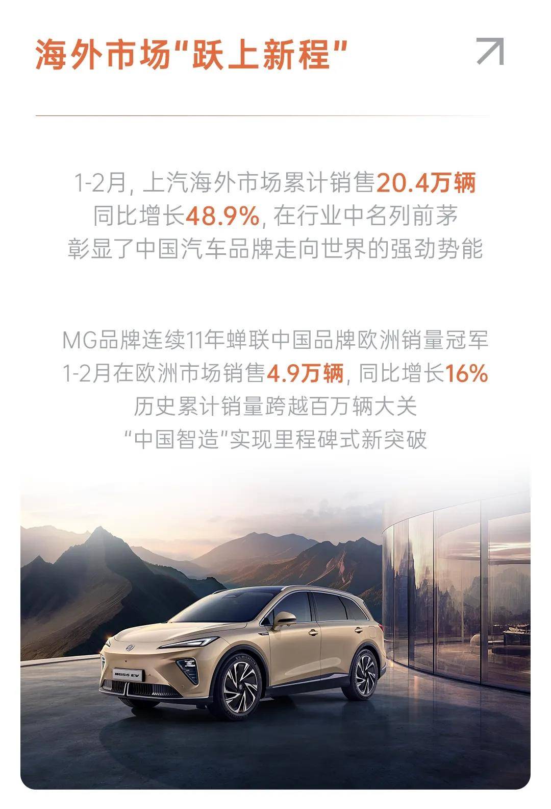 海外市场“跃上新程”。今年1-2月,上汽海外市场累计销售20.4万辆,同比增长48.9%,在行业中名列前茅,彰显了中国汽车品牌走向世界的强劲势能。MG品牌连续11年蝉联中国品牌欧洲销量冠军,1-2月在欧洲市场销售4.9万辆,同比增长16%,历史累计销量跨越百万辆大关,“中国智造”实现里程碑式新突破。已覆盖全球五大洲市场的智己汽车也在全球拓展中迈出重要一步,正式进入阿联酋与突尼斯市场,标志着其在中东及北非战略布局的进一步深化。
