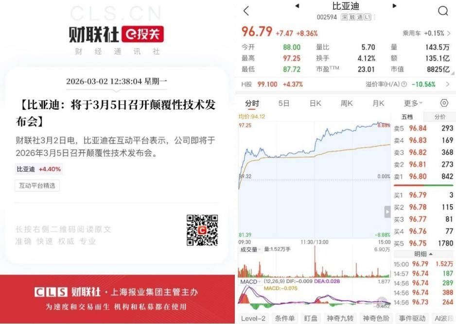技术层面的布局同样释放积极信号。3月2日,比亚迪在互动平台宣布将于3月5日举行颠覆性技术发布会,相关消息发布后市场反应迅速,公司A股当日上涨8.36%。资本市场的反馈,显示出投资者对企业硬核技术实力的高度认可与信心。