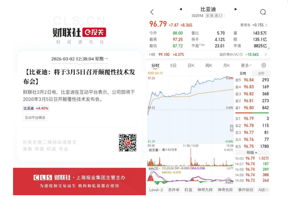 技术层面的布局同样释放积极信号。3月2日,比亚迪在互动平台宣布将于3月5日举行颠覆性技术发布会,相关消息发布后市场反应迅速,公司A股当日上涨8.36%。资本市场的反馈,显示出投资者对企业硬核技术实力的高度认可与信心。