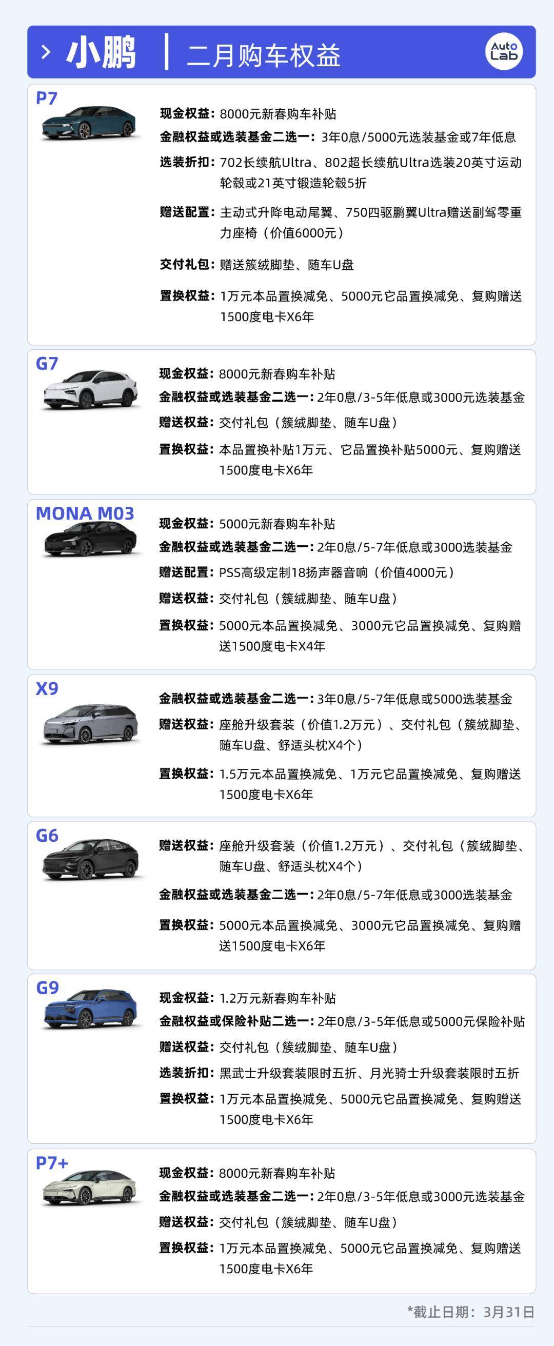 P7增加了8000元的新春购车补贴、至高1万元的置换减免以及复购的电卡,并且还赠送了升降尾翼和部分车型轮毂的选装折扣。