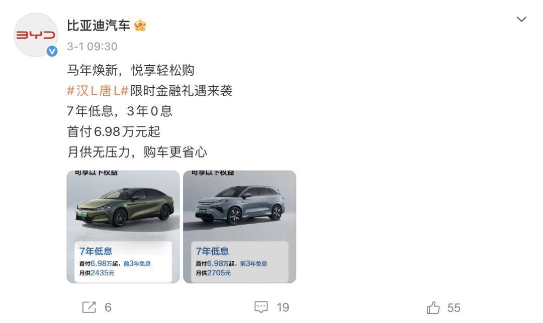 比亚迪也迅速跟进了这次的权益大战,从2月底起,旗下王朝网、海洋网、方程豹以及腾势品牌,全面铺开7年低息以及3年0息等金融政策。