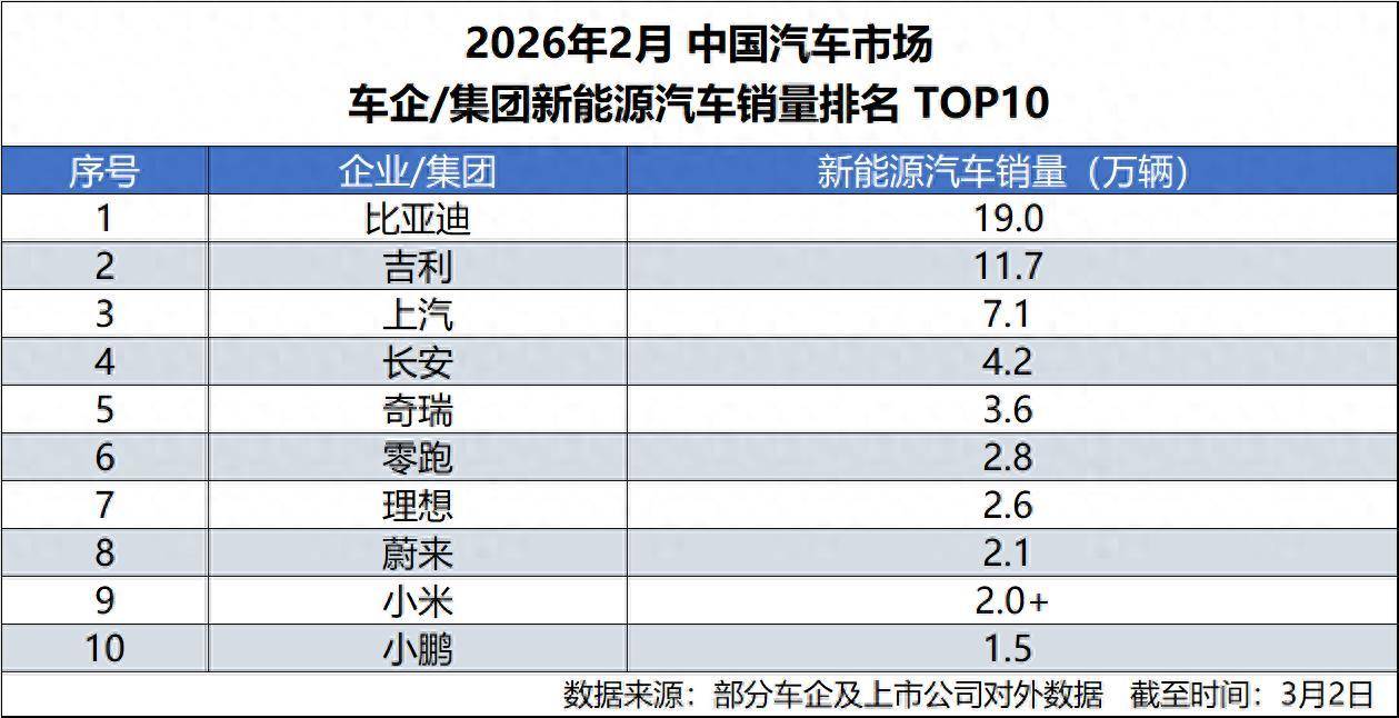 2026年开局,中国新能源汽车市场竞争格局进一步明朗。根据车企及上市公司对外披露的数据,比亚迪集团2月新能源汽车销量达190190辆,再度位居行业首位,在主流车企中持续保持明显领先优势,以稳定而强劲的表现巩固头部地位。