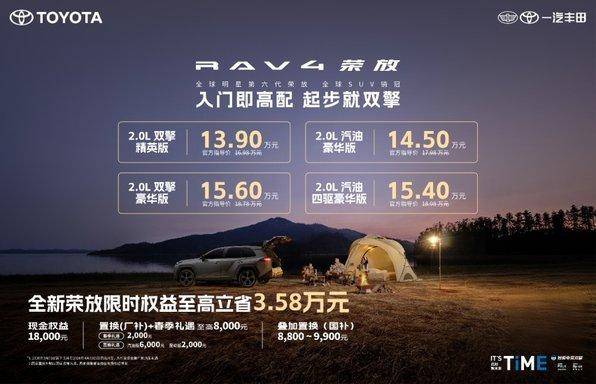 价格直降1.8万元、厂补至高8000元,再享受国补至高约万元,综合折算,购买全新荣放,真金白银至高立省3.58万元。因此,智能电混双擎精英版实际价格即全新荣放起步价仅为13.9万元。没有套路,没有期货;入门即高配、起步就双擎、上车有TSS 4.0智行(参数|询价)安全,且油混同强;购买全新荣放,品质口碑更可靠、长期价值更划算,买车一步到位更省心。