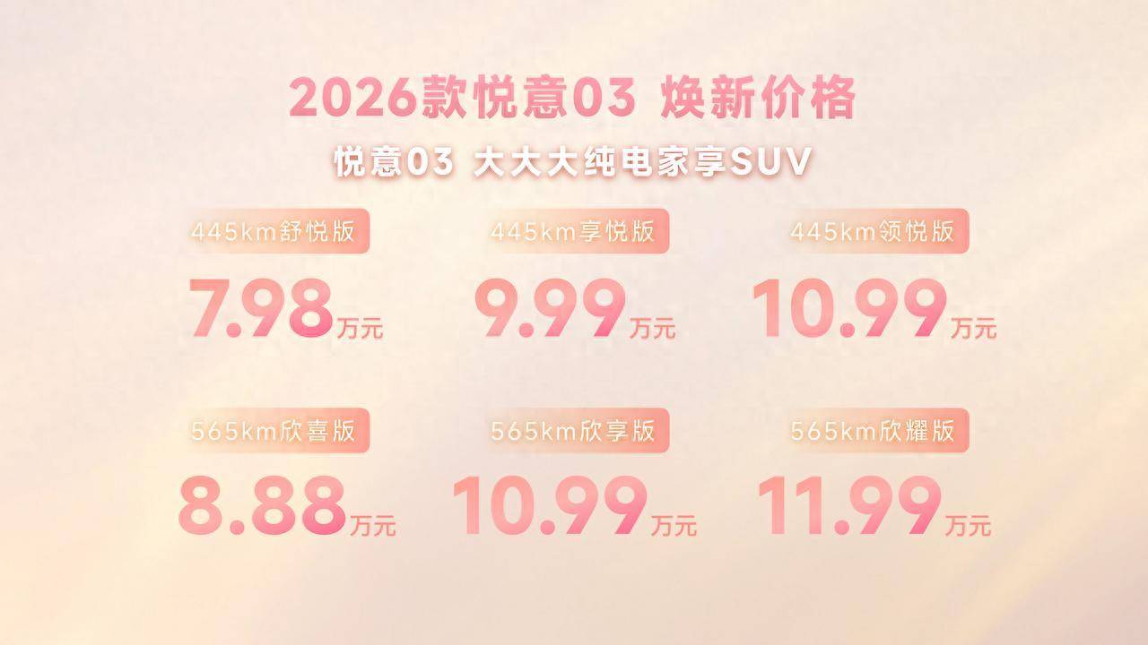 三月春暖,悦见花开。3月8日妇女节,实力演员张若昀直播助阵,“大大大纯电家享SUV”焕新而来,2026款悦意03挚爱上市,为每一位女神献上春天的礼物。445km、565km两种续航共计6款车型,官方售价7.98-11.99万元。围绕年轻小家庭,尤其是家庭女性用户的进阶需求,从颜色推新到舒适满配,2026款悦意03带来全新晨晖金车色、晨曦白内饰色等20余项升级,让用车更舒心、开车更省心、养车更安心,正如张若昀所说:“悦意03是真舒适的纯电SUV。”当前购车还可享7年0息贷款、无门槛整车及三电终身质保等丰富权益,轻松开启高品质纯电生活。