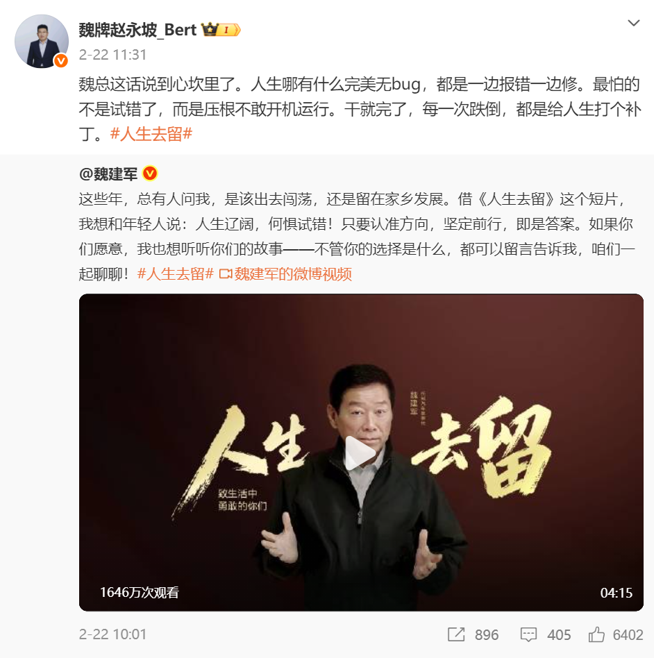 相比很多车企领导为了出镜而出镜,要么呆若木鸡,要么用力过猛……爱岗敬业、爱吃面爱运动的魏老板,一本正经唠嗑,却也自带网感,(真实)粉丝还是不少——没人比他更适合代言魏牌,符合流量逻辑,且政治正确。