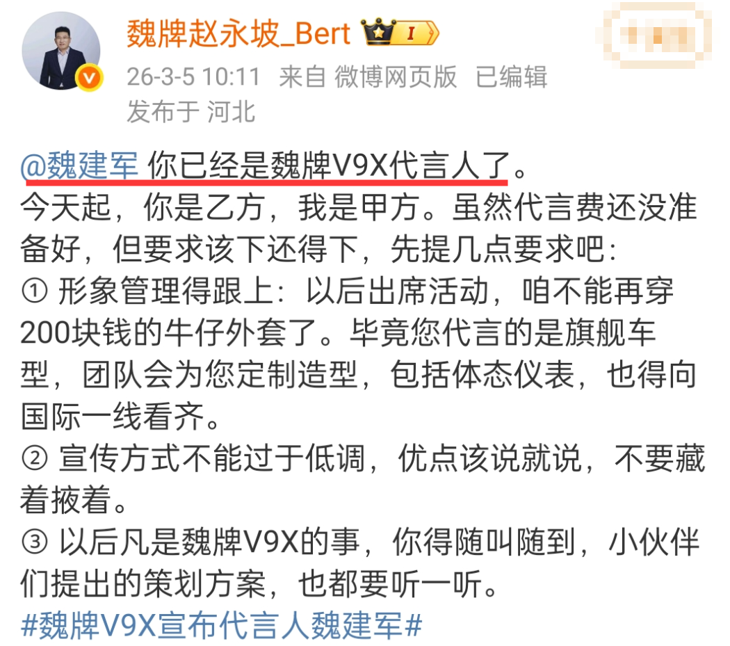 3月5日,代言海报放出后,魏牌CEO赵永坡还在微博上公然喊话老板,称老板是乙方,并提出三大要求(道歉后,这条微博已删)。