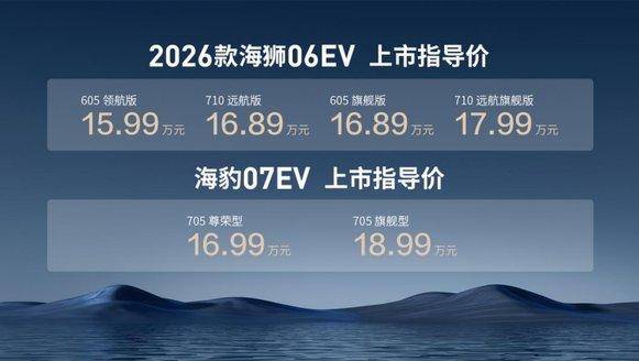 2026款海狮06EV官方指导价为15.99万元-17.99万元,并推出实力焕新礼、实力无忧礼、实力闪充礼、实力智联礼多重购车礼遇;海豹07EV官方指导价为16.99万元-18.99万元,即日起,用户可享出众金融礼、出众焕新礼、出众智联礼、出众守护礼、出众闪充礼多项购车礼遇。