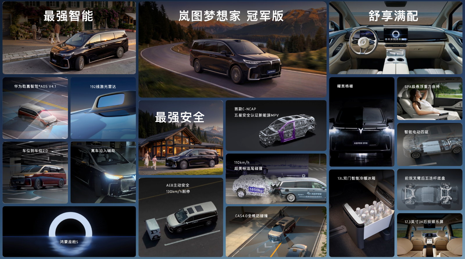 一直在引领,从未被超越!在当下家用MPV市场,还没有一款产品能够在智能、安全、舒适三大核心维度,全面满足用户需求,真正做到全面领先。站在第20万辆的新起点,岚图汽车携手华为乾崑,限量推出岚图梦想家冠军版,将智能、安全、舒适的核心优势带入更多家庭,共同开启智能家用MPV新时代!