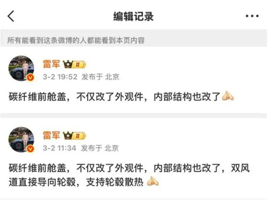 而最微妙的细节发生在舆论爆发之前。雷军那条写了"双风道直接导向轮毂"的微博,发布8小时后被悄悄删掉了最后一句。没有说明,没有更正,只是沉默地删除。