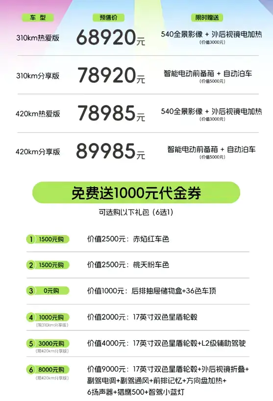 预售权益这块,奇瑞诚意拉满。用户支付99元定金可抵扣999元购车款,还能享受优先交付权,官方还提供三电终身质保、专属金融方案与个性化改装选装服务。不同车型还有专属限时赠送权益,310km热爱版赠540全景影像+外后视镜电加热,310km分享版赠智能电动前备箱+自动泊车,420km热爱版赠540全景影像+外后视镜电加热,420km分享版赠智能电动前备箱+自动泊车,部分车型还免费送1000元代金券。同时新车还有6选1的选装礼包,可选择专属车色、储物配件、轮毂或高阶配置等,满足不同用户的个性化需求。