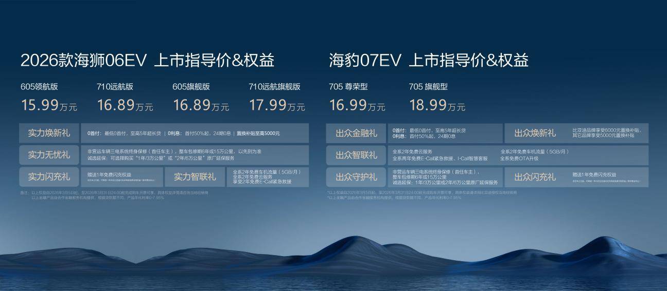 2026 款海狮 06EV:定位中型纯电 SUV,官方指导价15.99 万元 - 17.99 万元。作为 “百日十万辆” 爆款升级之作,新车拥有超 170 项全系标配,兼顾大空间、高舒适、强智能,可选装 “天神之眼 5.0” 智能驾驶系统,是家庭用户的高价值首选,秉持 “上市即开售、到店可体验”,拒绝期货等待。2026 款海豹 07EV:定位中型纯电轿跑,官方指导价16.99 万元 - 18.99 万元。以动感溜背造型、精准驾控调校、越级智能配置,打造都市年轻群体出行新 ICON,颜值与实力双在线,出众不止一面。