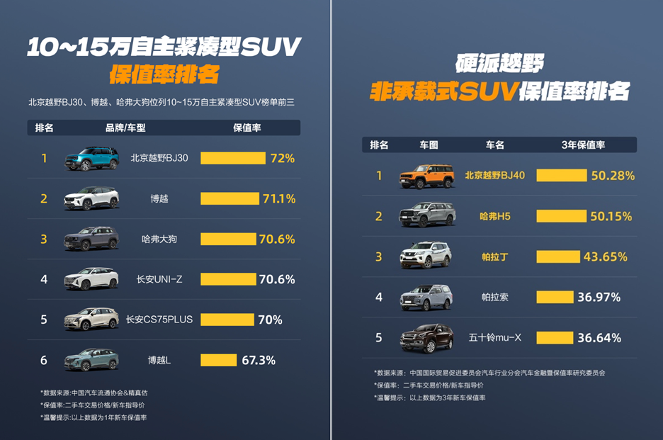 先看BJ30,在10-15万自主紧凑型SUV这个“卷王”赛道里,硬生生拿下了72%的保值率,直接把一众竞品按在地上摩擦。要知道,这个价位段的消费者最精明了,他们用脚投票的结果,就是BJ30成了轻越野市场的“抗跌神器”。