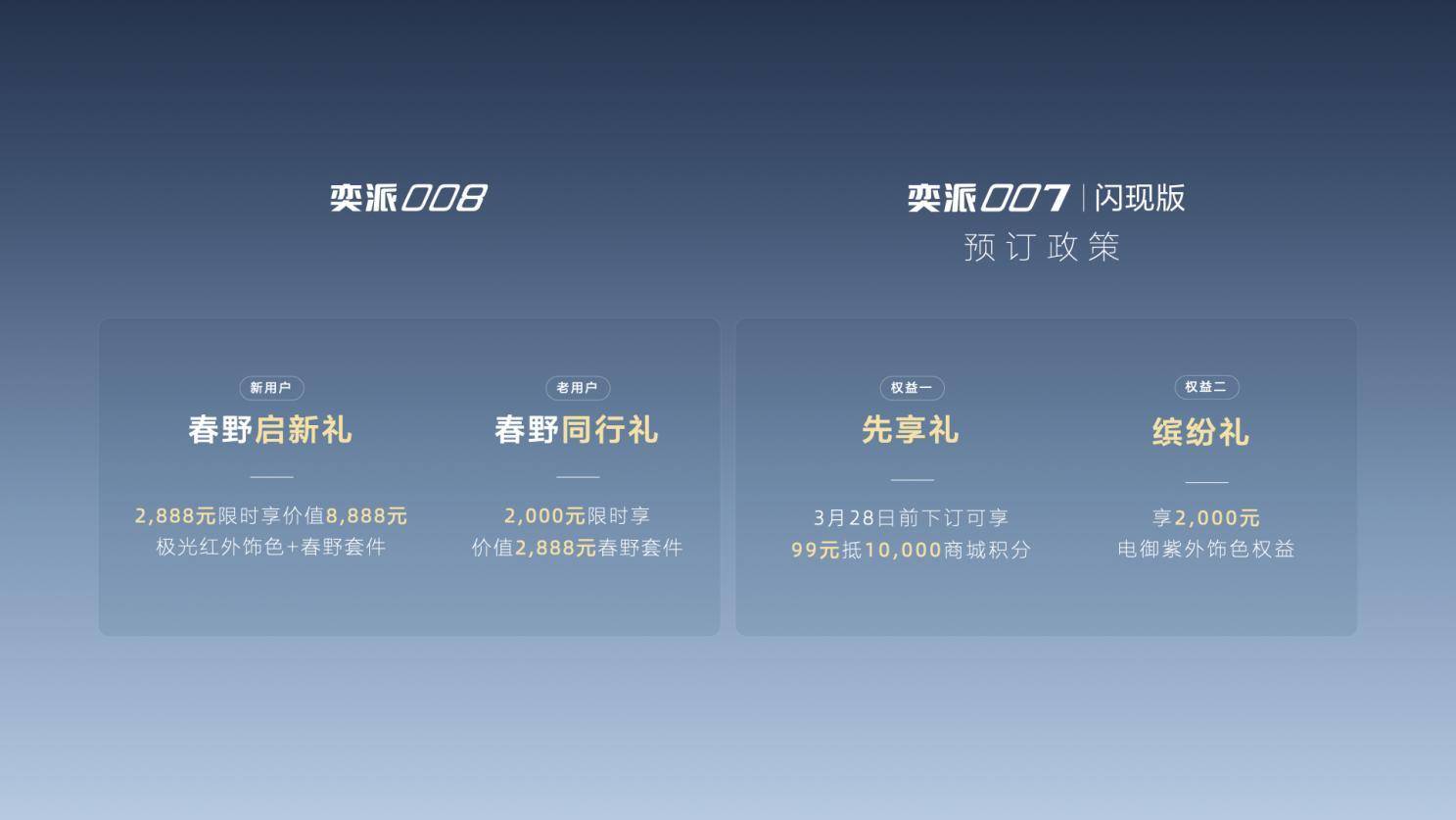奕派008“极光红”全新车色由东风奕派与用户共创,并携手中国国家地理将阿勒泰红色极光复刻于车身,车漆质感通透且抗刮耐磨。以车顶横杆行李架+固定侧踏板+放电插排为组合的“春野套件”,全场景适配城市露营与户外穿越,解锁更自由的探索生活。为回馈新老用户支持,推出限时购车权益,新用户下订极光红外饰色绑定春野套件限时先享价2888元;老用户可在APP下订春野套件,限时回馈价2000元。此外,奕派008即将全系推送OTA 升级,在娱乐影音、行车安全、车机智能交互等方面,全面优化用车体验,为用户带来更安全、更好玩的用车体验。