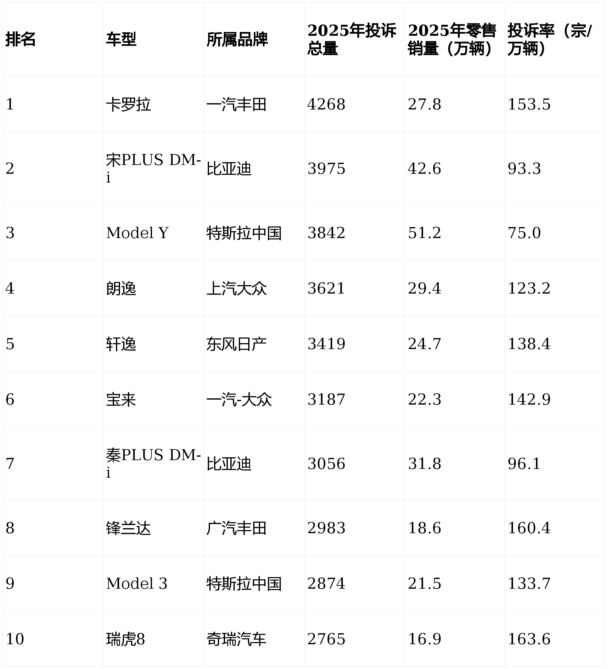 特斯拉Model Y和Model 3分别排在榜单第三和第九位。其中Model Y以51.2万辆的年销量,拿下了2025年国内SUV销量冠军,3842宗的投诉量,对应下来投诉率只有75.0宗/万辆,是TOP10车型里最低的。其高投诉总量完全是庞大的销量基数带来的。两款车型的投诉,主要集中在悬挂系统异响、转向机故障,还有车机死机黑屏、辅助驾驶功能失灵,以及售后维修推诿、配件等待周期过长这几个方面。