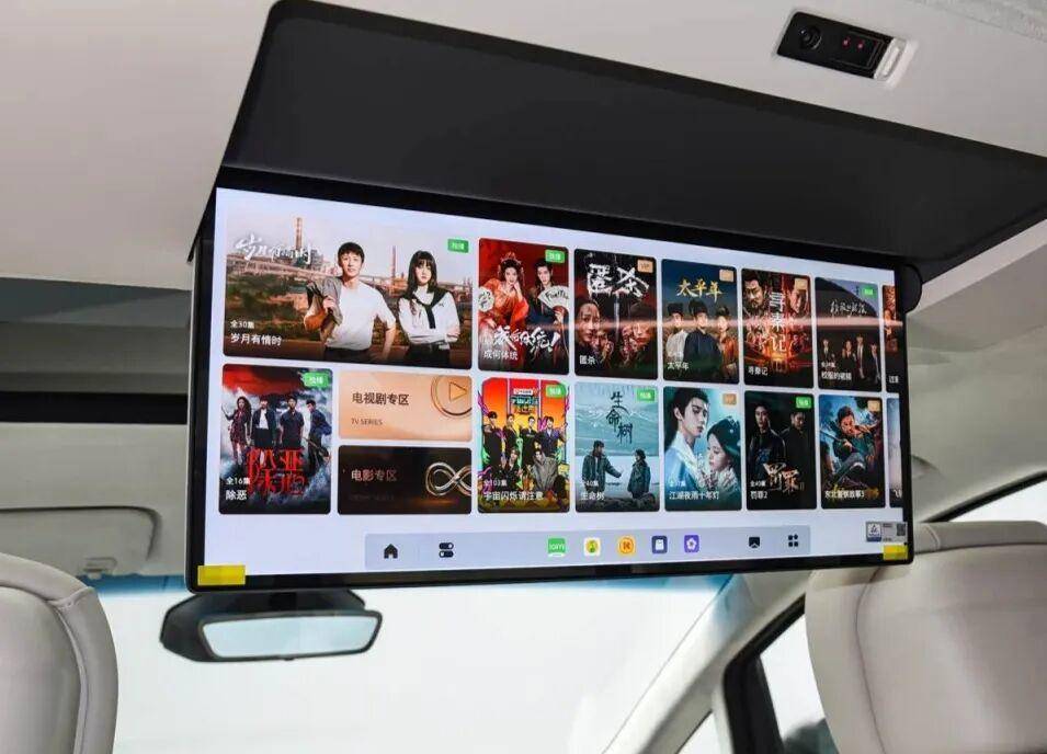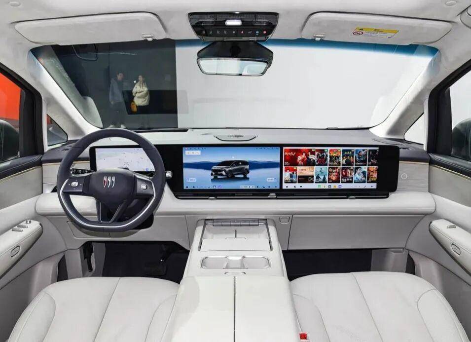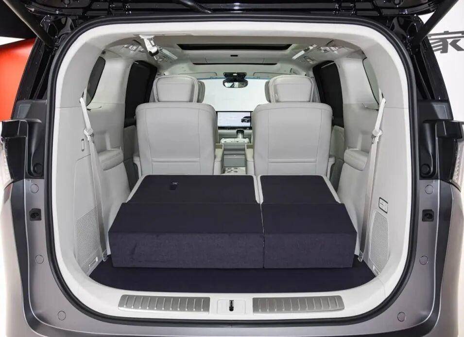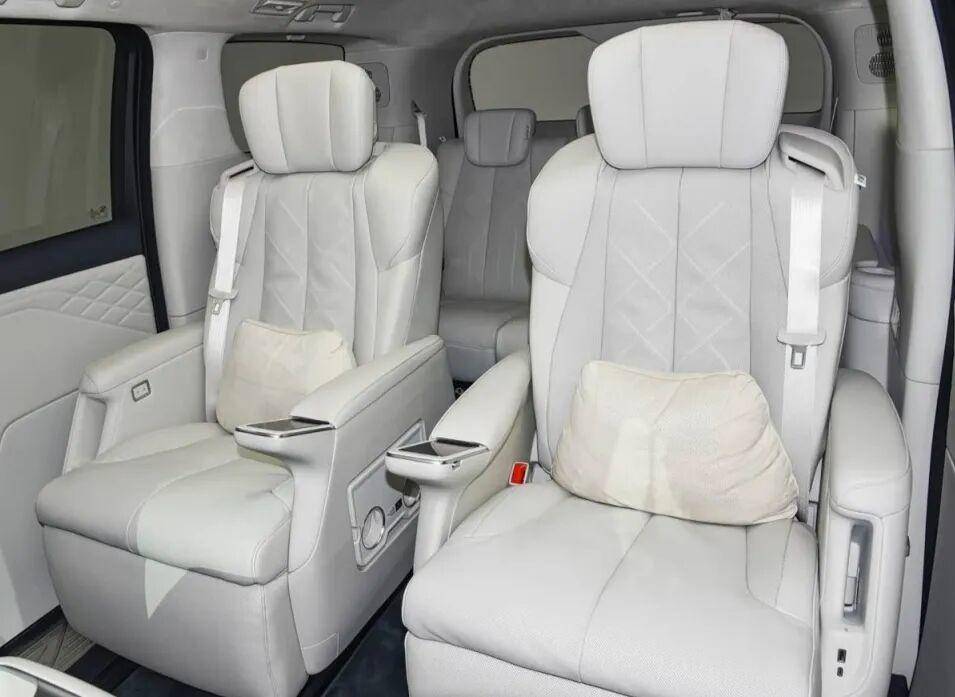 内饰延续简约高级风,大面积软性面料包裹,8块屏幕组成沉浸式交互,50英寸AR-HUD+双16.3英寸中控副驾连屏+21英寸4K吸顶屏,AI语音大模型控制超700项指令,BOSE音响加持,座舱科技感与豪华感拉满,三排Nappa座椅均配备加热通风按摩,二排零重力模式搭配冷暖箱与双桌板,商务接待舒适感直接拉满。