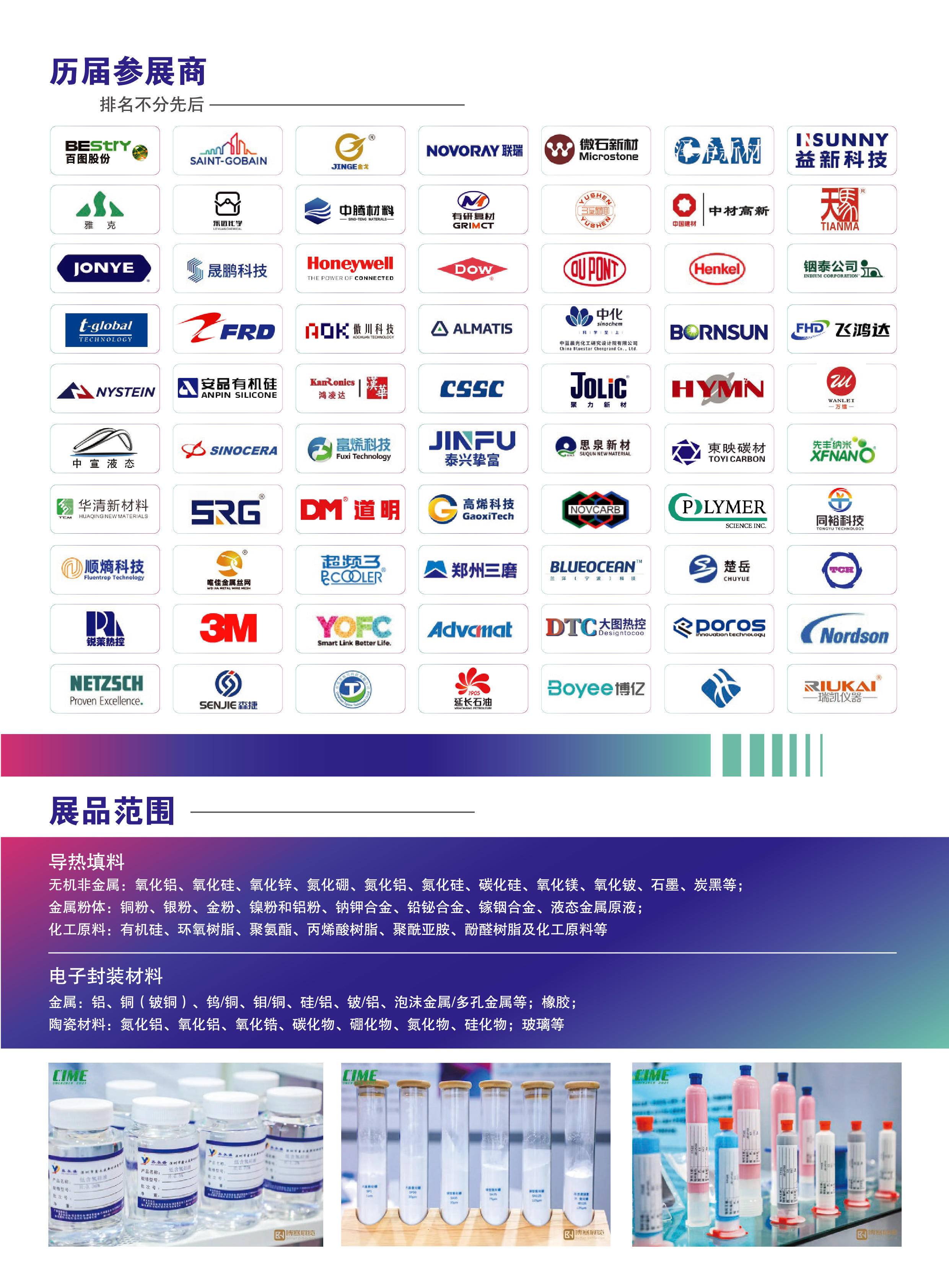 二是导热散热材料板块,展品涵盖范围广泛,是热管理产业的核心基础板块。其中包括离型膜、氧化铝、球形氧化铝、氢氧化铝、微硅粉、氧化锆等导热粉体,石墨烯粉体、石墨烯薄膜、纳米材料、纳米碳材料等新型材料,以及液态金属导热片、硅胶片、绝缘材料、双面胶、基板、导热矽胶布、碳纳米管、金刚石涂料等产品;同时展示导热硅脂、相变材料、散热膜、导热泥、云母片、垫片、灌封胶等各类辅助导热散热材料,全方位满足消费电子、汽车、半导体等不同领域、不同场景的导热散热需求。