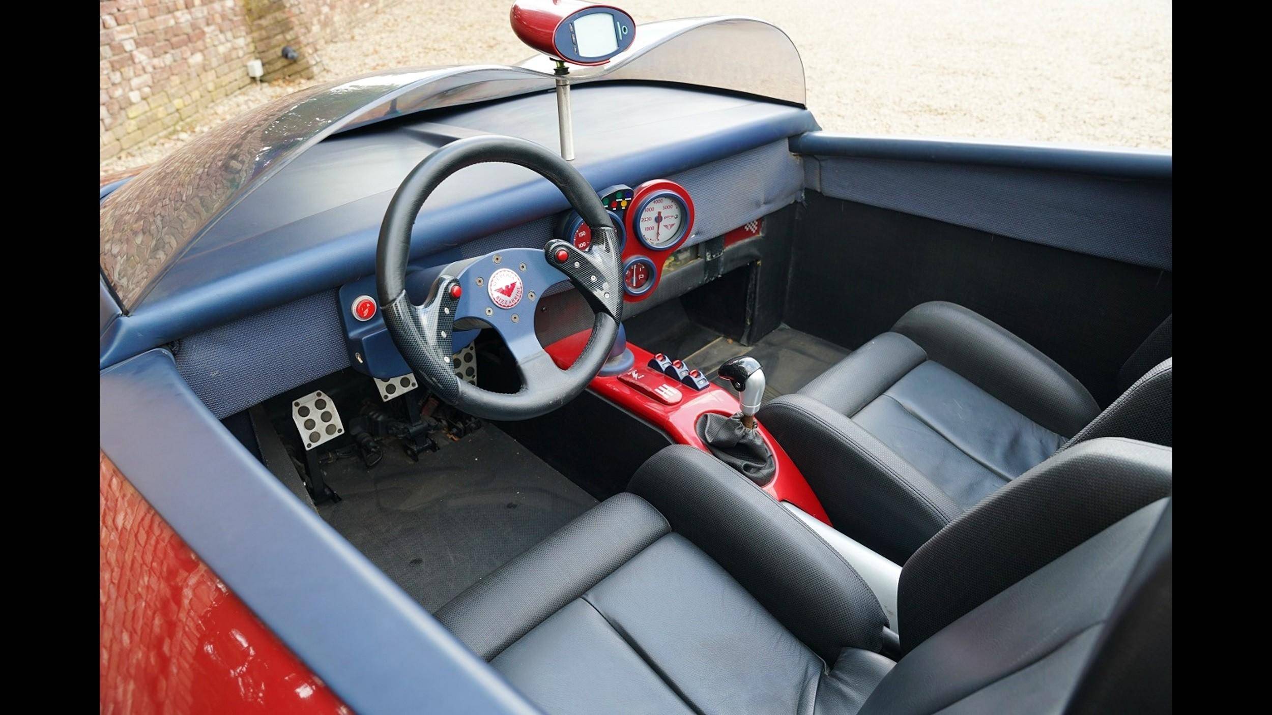 整车于2000年都灵车展正式亮相,车身以碳纤维和复合材料制成,覆盖于管状车架之上,造型上汲取了Bizzarrini 5300 GT与P538S赛车的设计语言:船头般尖锐的车头、大面积环抱式头灯、突出的侧面进气口,以及车尾一系列三角形冷却格栅构成的几何秩序感。敞篷式座舱上方设有双拱形防滚架,整体风格兼具竞技气质与未来主义色彩。车厢内部布置颇为简朴,可见外露的主电源开关与继电器,是概念车的典型处理方式。