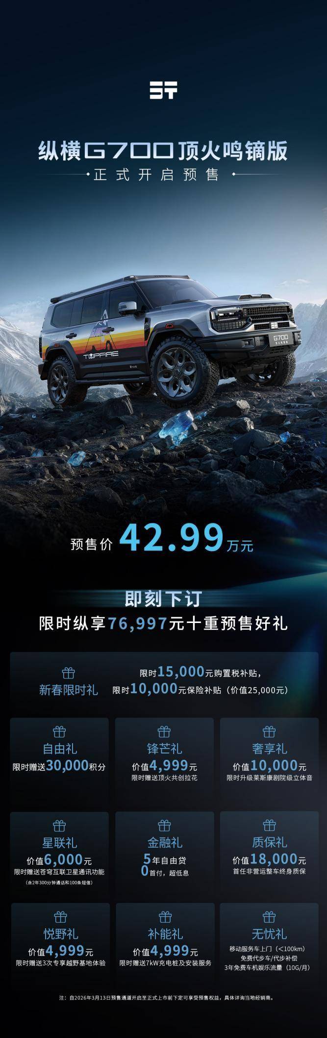 纵横G700顶火鸣镝版现已正式开启预售,限时权益价42.99万元起。为回馈用户,官方推出总价值76,997元的“十重豪礼”,涵盖购车补贴、用车保障及玩车体验全链路福利。权益内容包括购置税与保险补贴、专属积分、终身质保及越野基地体验等,全方位满足用户多元需求。目前,官方线上预订通道已全面开放,所有权益支持实名锁定,先到先得。