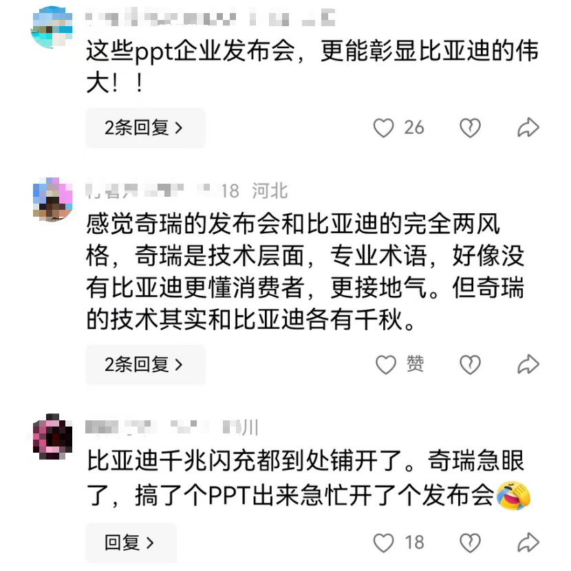 反感的声音认为奇瑞这次是PPT大会,是跟风、画饼。更被一些比亚迪的粉丝调侃“比亚迪一量产,奇瑞就跟上”。
