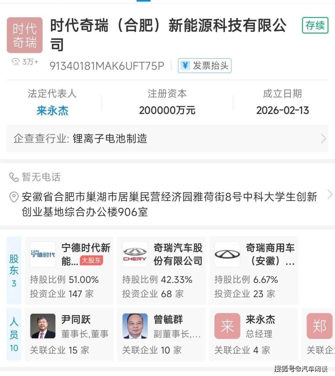 上述三家公司,两家注册地在奇瑞的大本营芜湖,时代奇瑞落地合肥。
