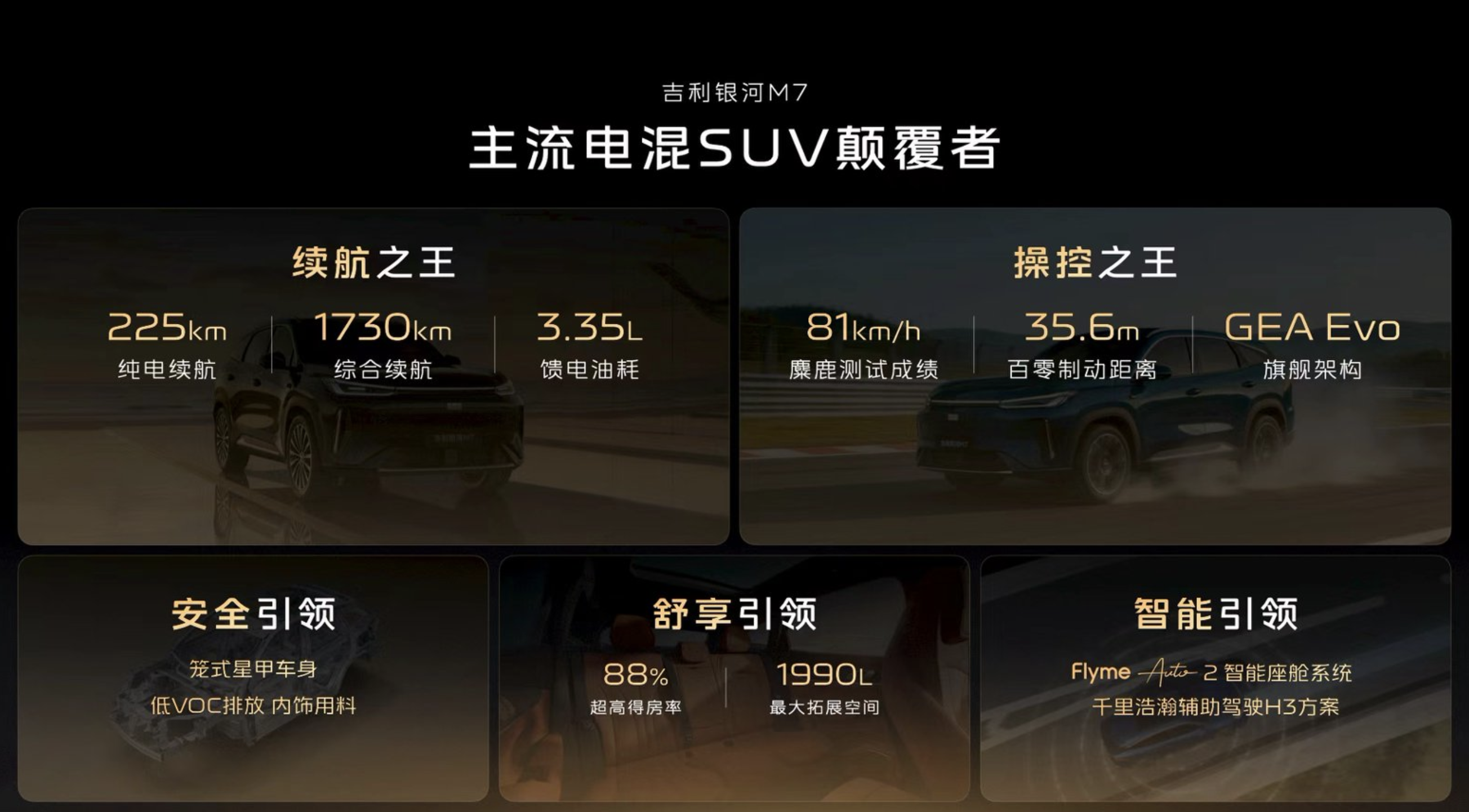 吉利银河M7的“不妥协”,本质上是技术体系和规模效应带来的“降维打击”。GEA架构、AI虚拟调校、神盾金砖电池、千里浩瀚智驾、雷神EM超级电混——这些过去分散在不同品牌、不同价位的技术尖点,被整合在一台主流电混SUV上。