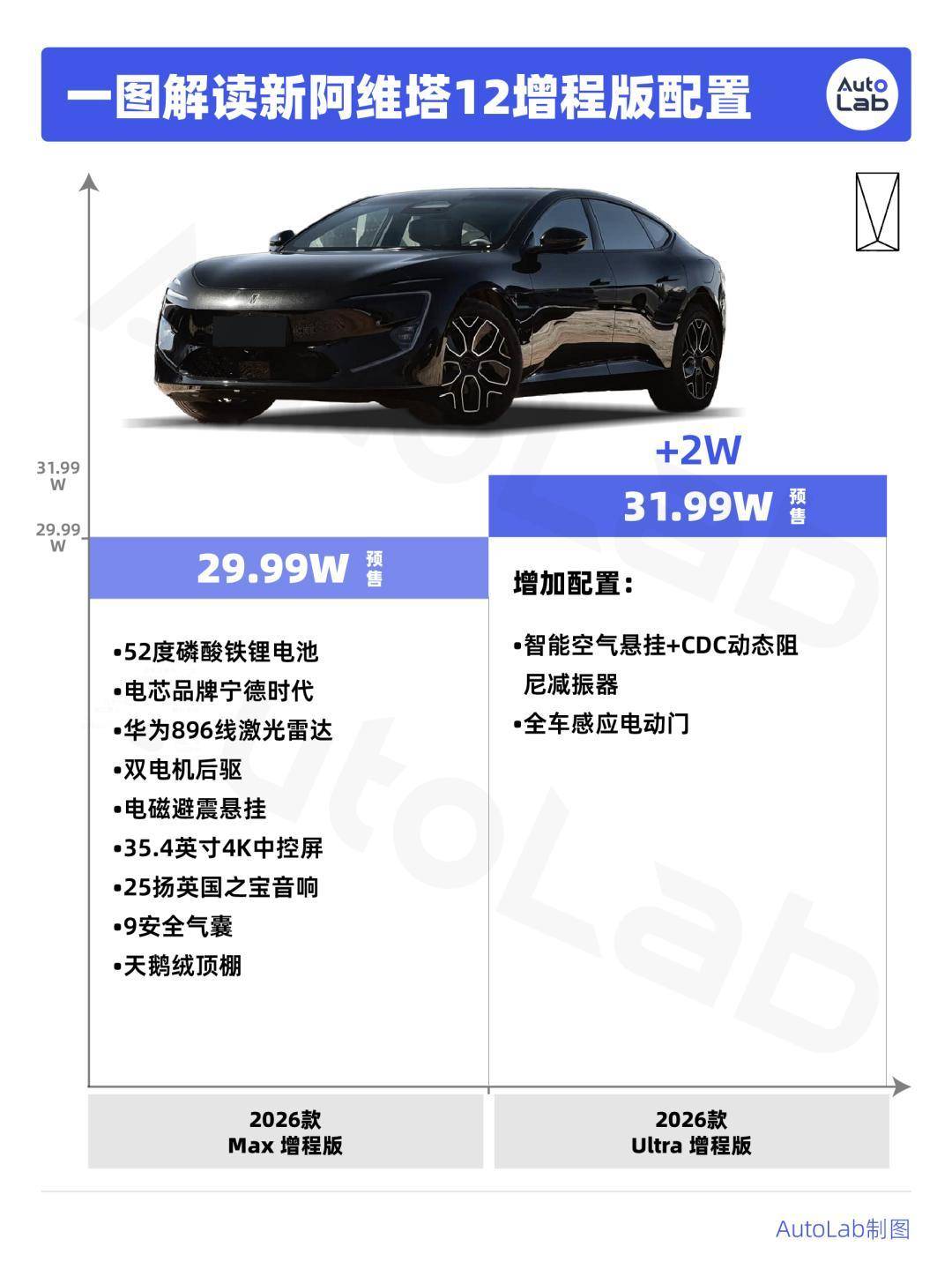 入门版是Max双电机增程版,它的价格是29.99万,搭载了华为896线激光雷达、电磁避震悬挂、25扬声器英国之宝音响等配置。