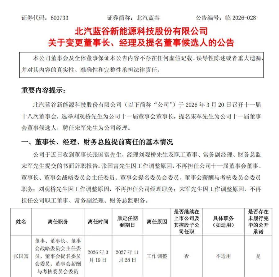 两个公告放在一起看,真相就浮出水面了:张国富辞去了北汽蓝谷的董事长职务,但他依然是北汽集团的党委常委、副总经理,同时即将接任北京汽车的董事长。换句话说,他不再亲自担任北汽蓝谷的董事长,但继续在北汽集团层面分管相关工作,同时把北京汽车这边的董事长职务也接了过来。
