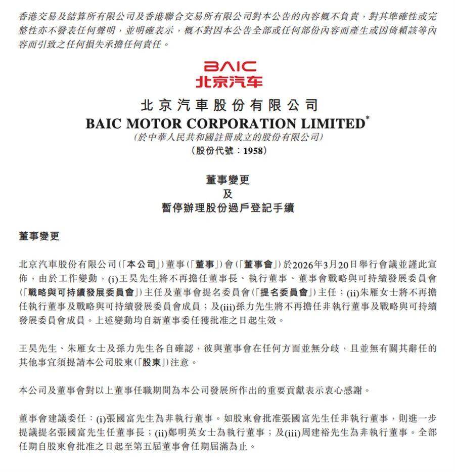 再看北京汽车那边的公告,张国富被提名为非执行董事,如获股东会批准,将进一步提名他担任董事长。与此同时,公告还披露了张国富的现任职务——北京汽车集团有限公司党委常委、副总经理,北京汽车股份有限公司党委书记。